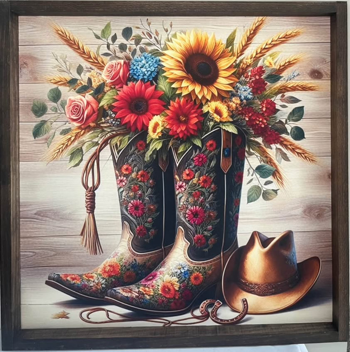 Looking for something different for your home decor? This image with cowboy boots and flowers has beautiful, vibrant colors that will make it pop on your walls. It is created with high quality canvas and inks along with select pine frame, offering a durable yet lightweight design. Ready to hang or easily displayed on any flat surface, it brings rustic charm and subtle elegance to your home décor. Its light weight ensures versatile placement with minimal effort, making it an ideal accent for any farmhouse-inspired setting.