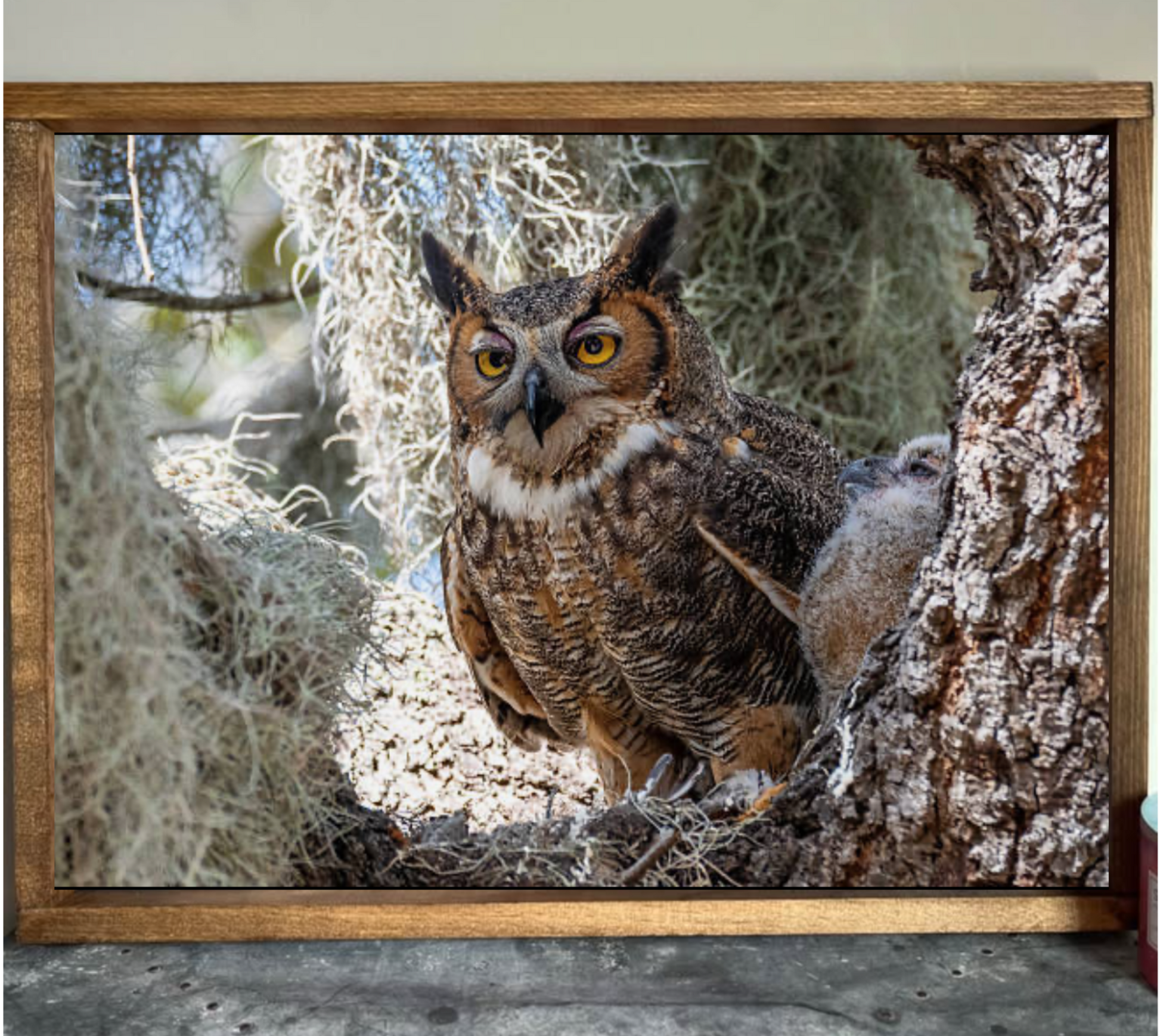 A Great Horned Owl peers from a tree cavity, its yellow eyes sharp beside a fuzzy owlet nestled in moss. The woodland textures capture a quiet moment of wild protection. It is created with high quality canvas and inks along with select pine frame, offering a durable yet lightweight design. Ready to hang or easily displayed on any flat surface, it brings rustic charm and subtle elegance to your home décor. Its light weight ensures versatile placement with minimal effort, making it an ideal accent for any farmhouse-inspired setting.