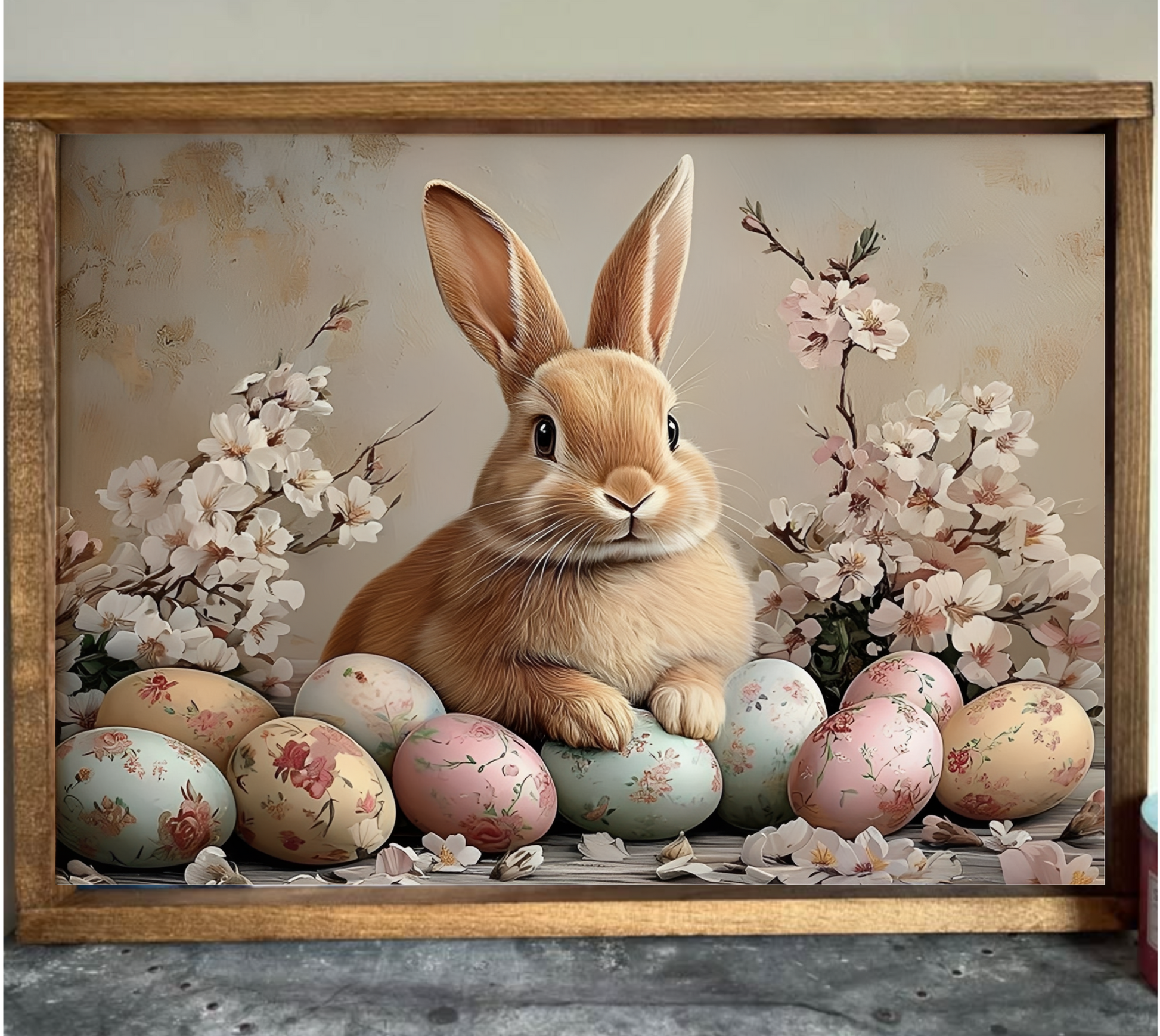 A light brown rabbit sits nestled among pastel Easter eggs, each decorated with delicate floral patterns. Surrounding the scene are blooming branches of white and pink flowers, creating a soft and festive springtime atmosphere. It is created with high quality canvas and inks along with select pine frame, offering a durable yet lightweight design. Ready to hang or easily displayed on any flat surface, it brings rustic charm and subtle elegance to your home décor. Its light weight ensures versatile placement with minimal effort, making it an ideal accent for any farmhouse-inspired setting.