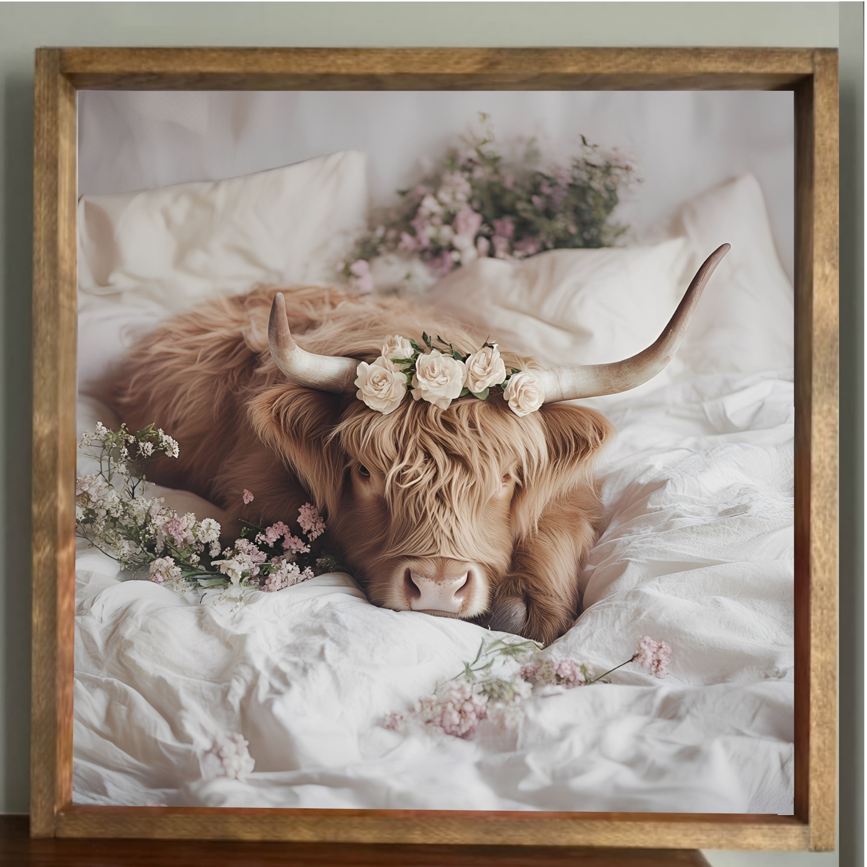 This Highland cow lounges peacefully on a white bed, crowned with cream roses and surrounded by pastel blooms. The dreamy setting blends rustic charm with soft, romantic elegance. So adorable displayed anywhere in your home. It is created with high quality canvas and inks along with select pine frame, offering a durable yet lightweight design. Ready to hang or easily displayed on any flat surface, it brings rustic charm and subtle elegance to your home décor. Its light weight ensures versatile placement with minimal effort, making it an ideal accent for any farmhouse-inspired setting.