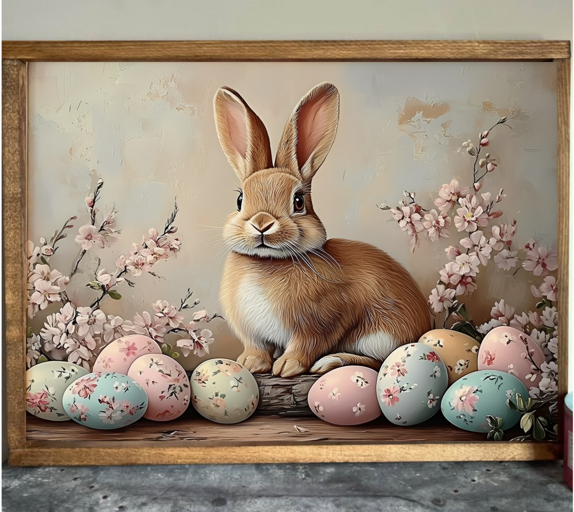 A brown bunny sits quietly on a wooden surface, surrounded by pastel Easter eggs adorned with floral patterns waiting to start hiding the Easter Eggs. Behind it, blooming branches with pink flowers add a soft springtime touch, while the neutral background keeps the focus on the gentle scene. It is created with high quality canvas and inks along with select pine frame, offering a durable yet lightweight design. Ready to hang or easily displayed on any flat surface, it brings rustic charm and subtle elegance to your home décor. Its light weight ensures versatile placement with minimal effort, making it an ideal accent for any farmhouse-inspired setting.